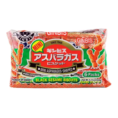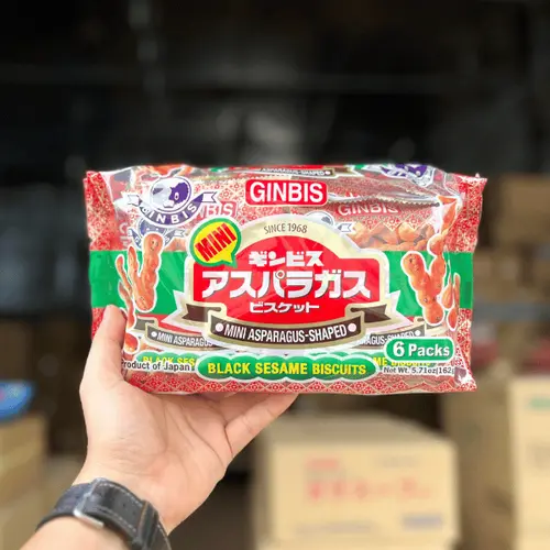 - Thưởng thức Bánh quy Ginbis hình măng tây 138g với hương vị thơm ngon từ mè đen và độ giòn hoàn hảo.